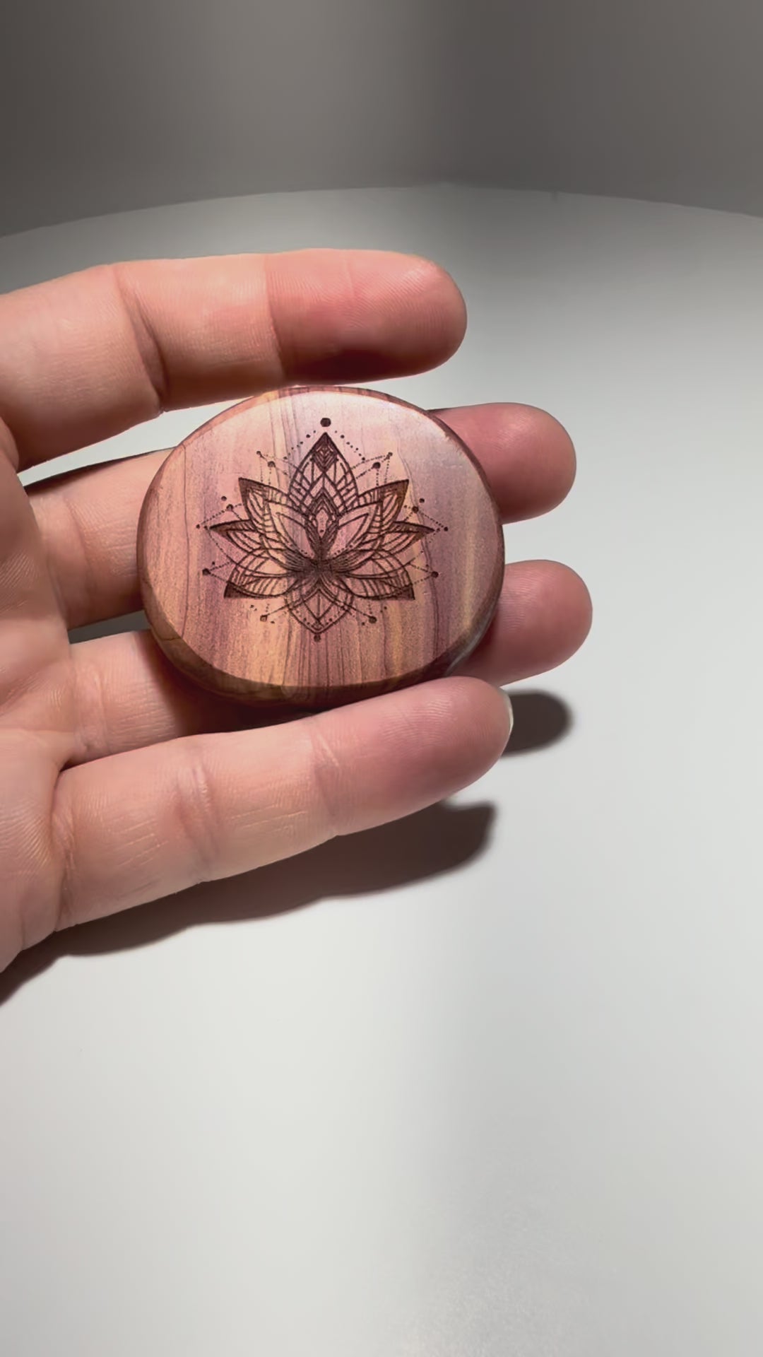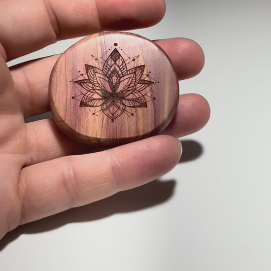 Handcrafted from Aromatic Cedar, the Sacred Geometry #108 Lotus flower wood palm stone/fidget wood is a perfect grounding tool. Its texture and form are pleasing and ideal for hand-held fidgeting. Finished with Real Milk Paint Co.’s Walnut Oil/Carnauba Wax blend, this fidget item boasts beautiful grain patterns and color.