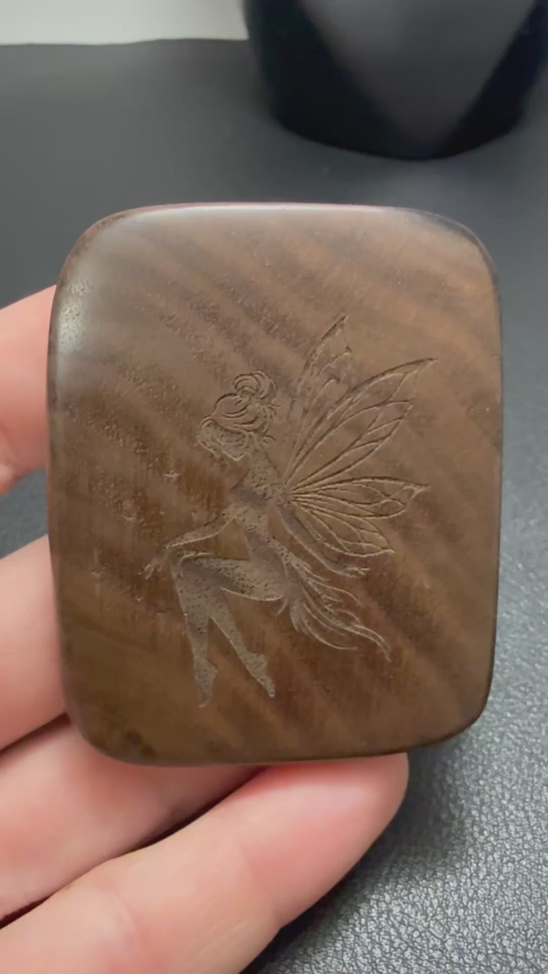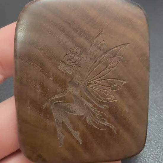This Black Walnut fidget wood has been carefully sanded to a silky smooth 1200 grit texture and features an engraved Fairy 1-143 design. Its aesthetically pleasing design is perfect for individuals who need to fidget without resorting to plastic toys. To ensure safety, it has been finished with beeswax and linseed oil, approved for butcher blocks. Please note, this product is not intended for children.