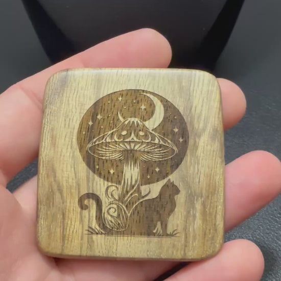 Fidget Wood square - Mystical Mushroom 187 on black limba. Expertly sanded to a silky smooth texture of 1200 grit. Features an engraved scene with a mystical mushroom, designed with esthetics in mind. Ideal for those who want an alternative to plastic fidget toys. Finished with a butcher block approved beeswax and linseed oil finish. Not suitable for children.