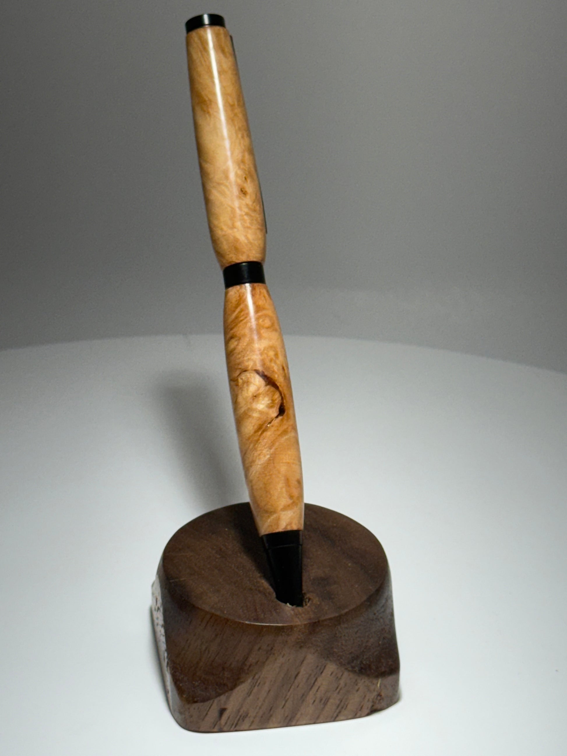 This slimline style twist pen boasts a beautiful pattern of handcrafted Maple Burl and sleek black trim. With a professional and unique look, it is finished with CA glue for a polished touch.