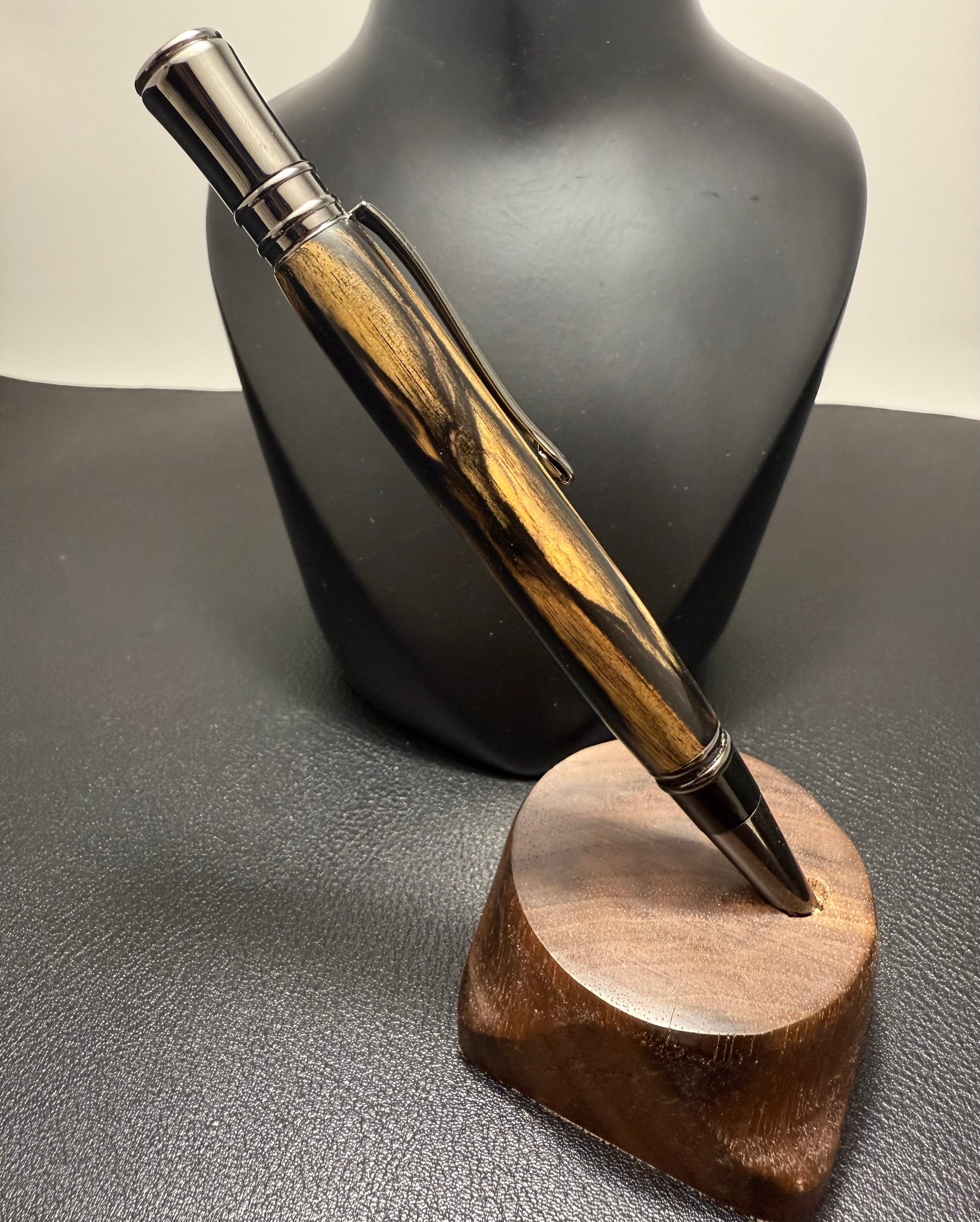 Crafted with gunstock trim, the Marble Ebony Executive pen boasts a unique design and polished finish created with CA glue. This one-of-a-kind pen features black ink and a medium ball point, making it a perfect choice for those seeking a standout piece.