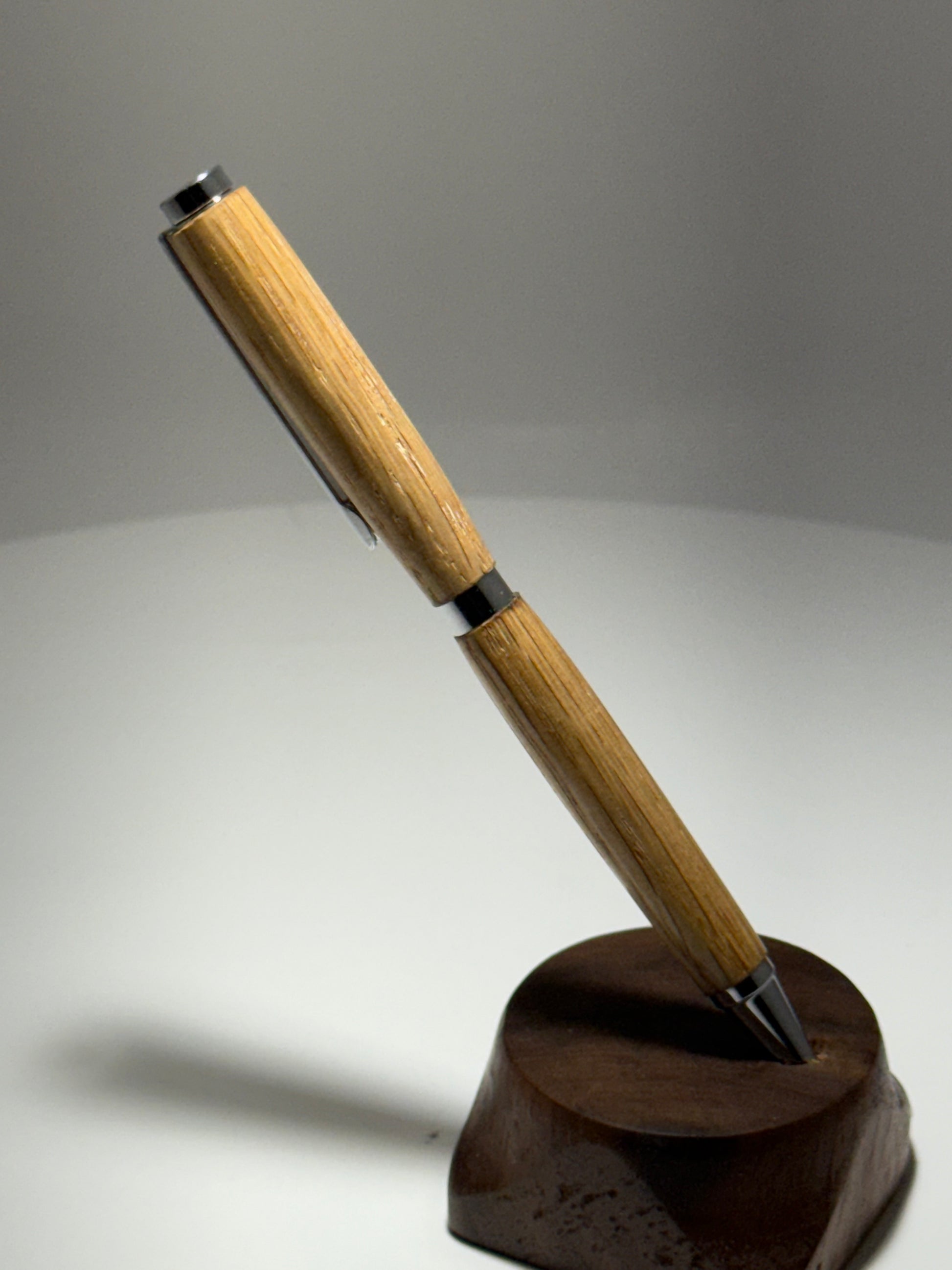 Crafted by hand, the Red Oak slimline style twist pen boasts elegant silver trim. The pen is finished with CA glue and has minor defects, adding unique character to this piece.