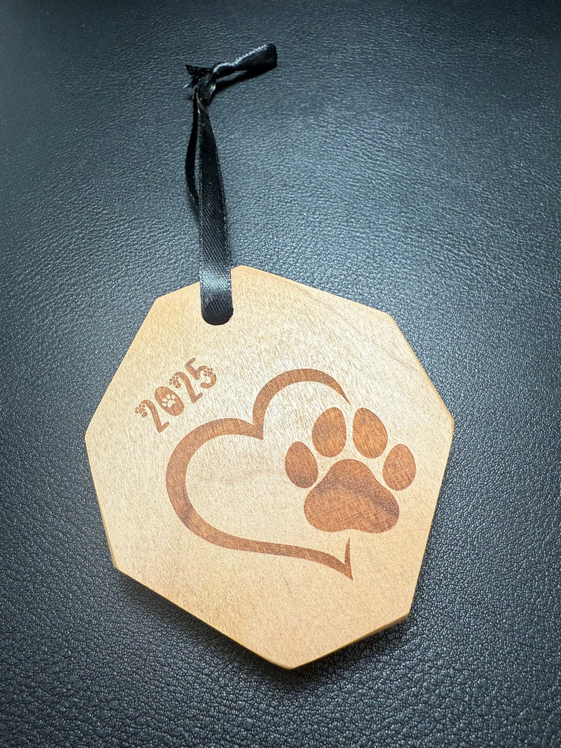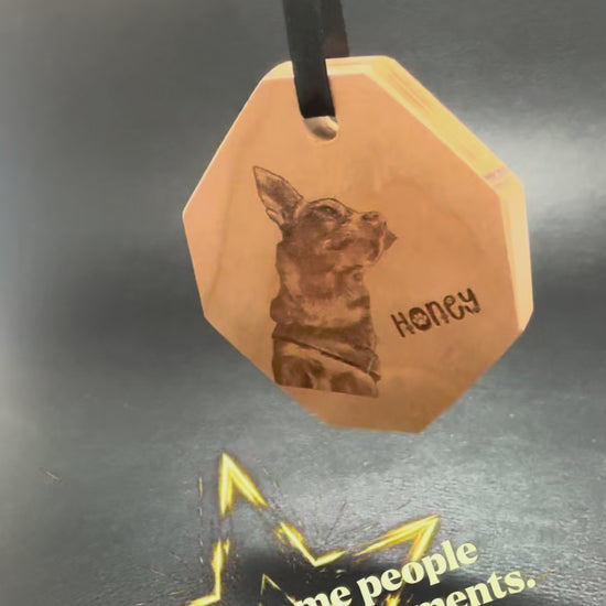 Custom Cherry wood ornament with black ribbon. One side has the year and a heart/paw icon. The other side is your custom portrait with your pet’s name. Font is automatically set to "Dog Paws". Finished with Furniture Clinic’s wood varnish for a glossy sheen. Perfect to treasure memories this holiday season.