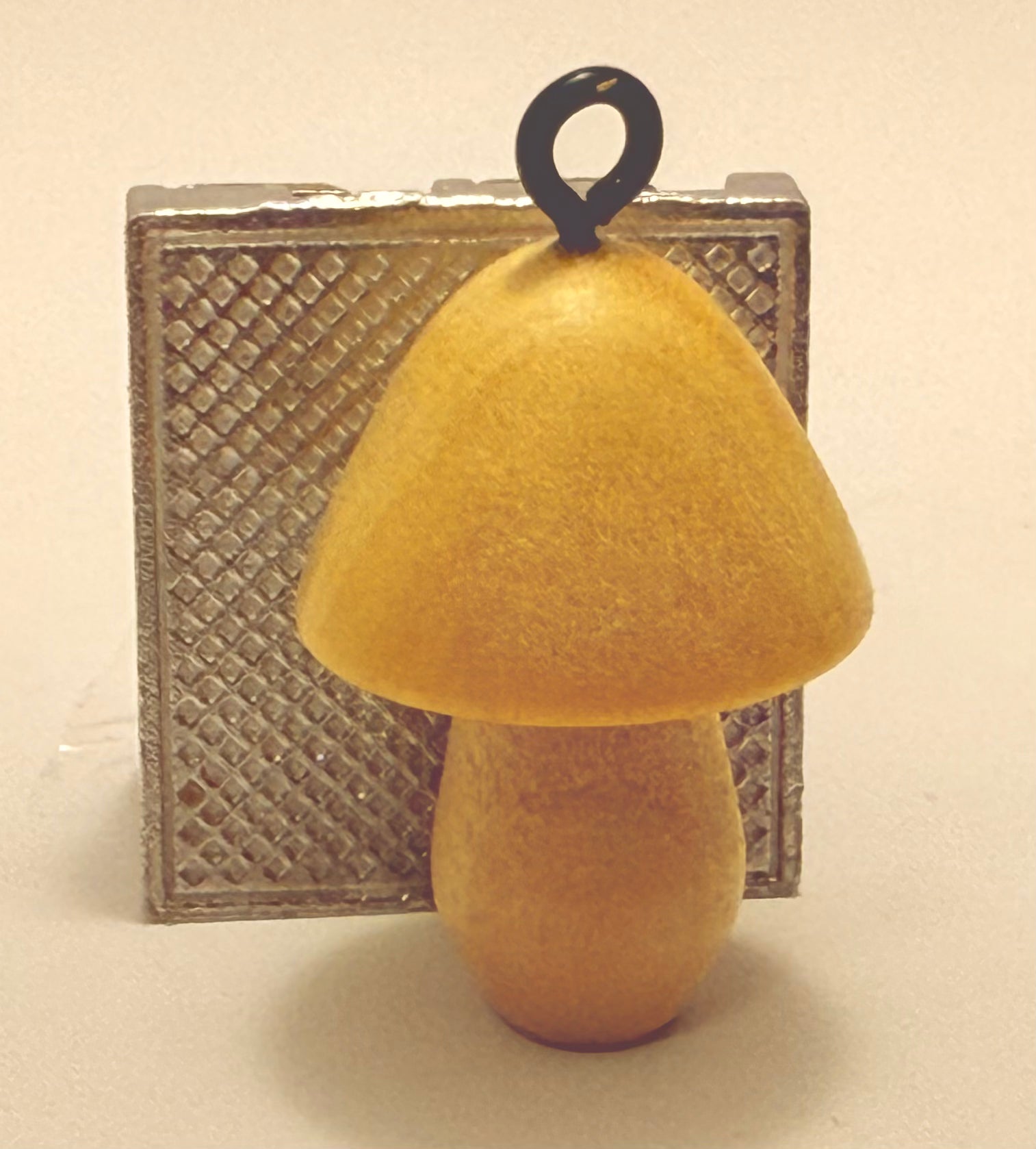 This Yellowheart mushroom pendant is a handcrafted piece with a 5mm eyescrew for attaching a necklace or displaying in any way desired. Measuring approximately 1 3/8" in height and 3/4" in width, it is finished with a blend of polymerized linseed oil, beeswax, and orange oil for a beautiful sheen.